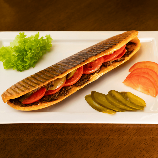Samoon, minced lamb meat, Aleppo spices, garlic, tomato, pickles, sauce